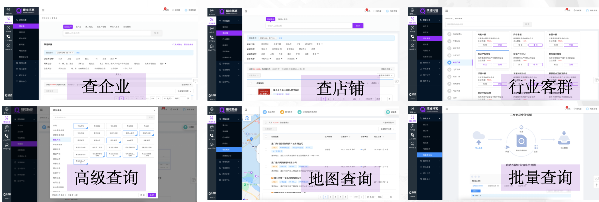 通过全网抓取3亿+企业客户信息数据,聚合企业工商、信用、融资、推广、招聘、经营、产品、资质、知产、进出口、招投标、展会等企业信息,用大数据技术和AI算法为制造业、企业服务、金融、教育、农业等行业提供精准目标企业客户数据及关键联系人手机号等。也可以导入自由企业名录批量查询联系方式。多种获客模式拓客线索为企业获取商机提供服务。